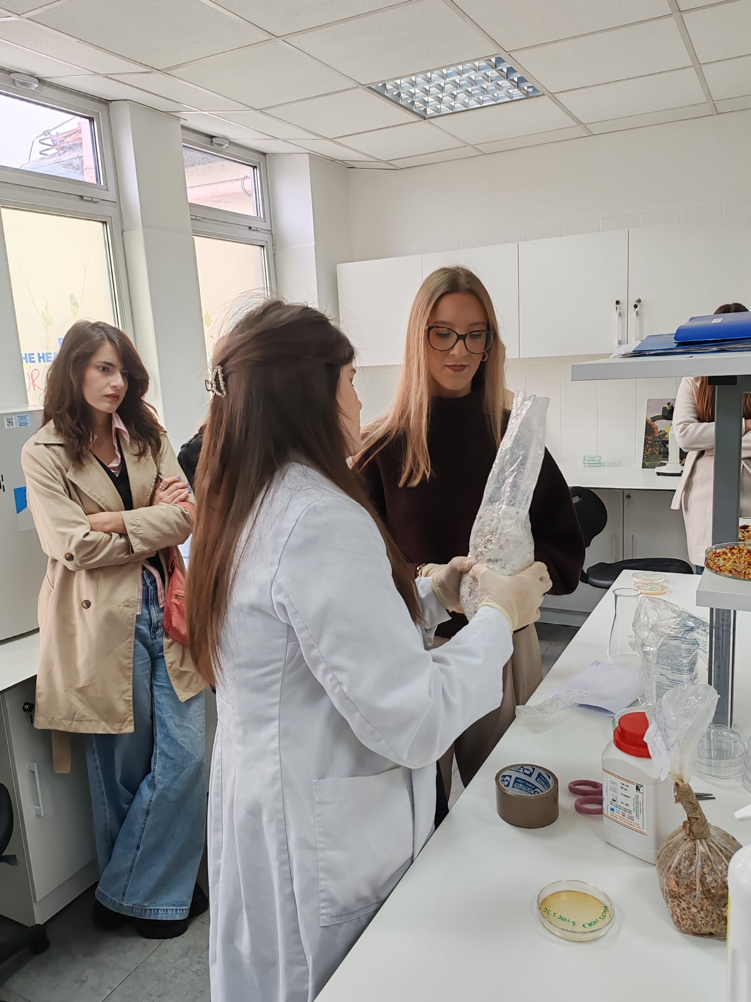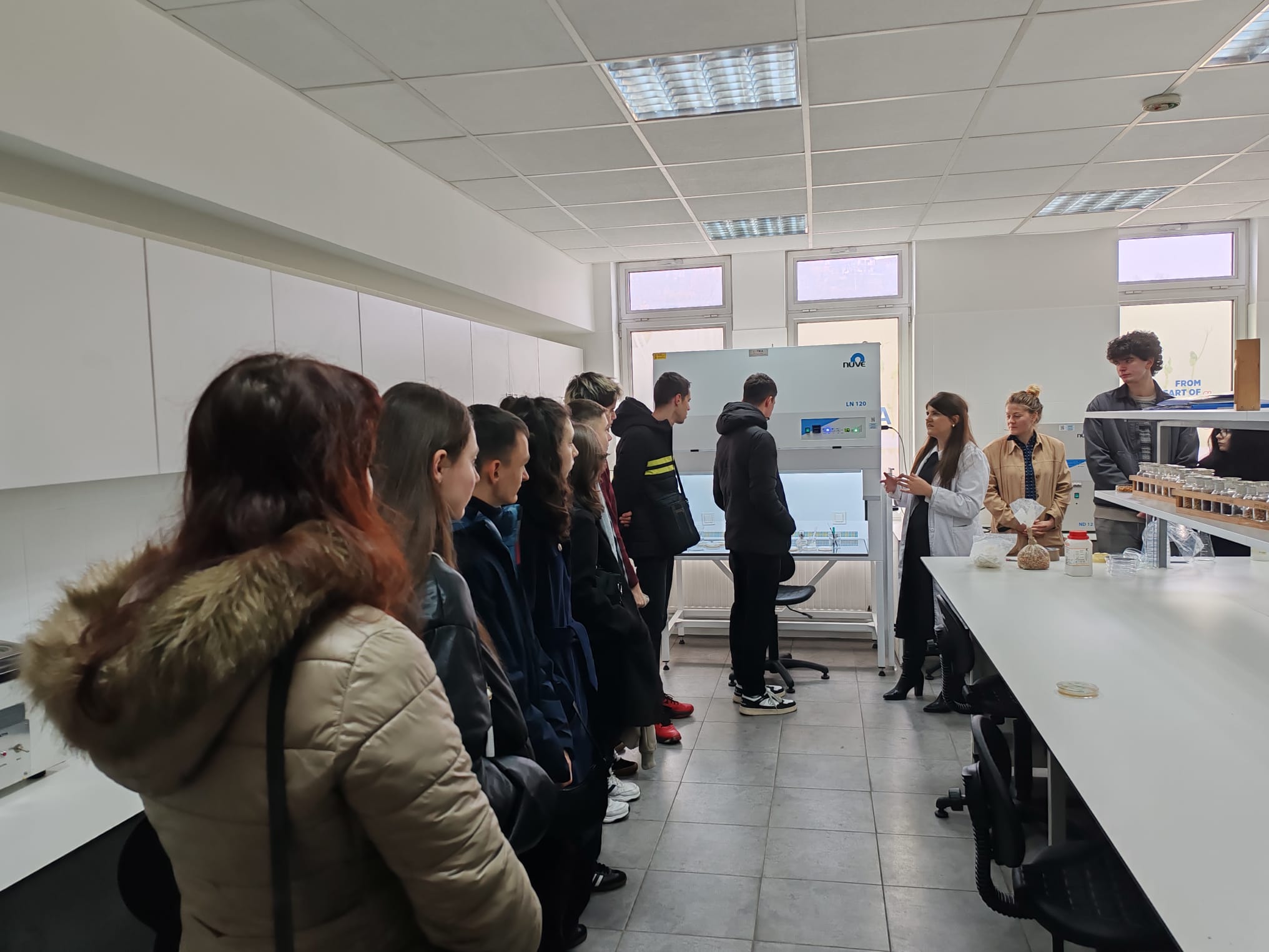 U Laboratoriji za ratarstvo, povrtlarstvo i krmno bilje, viša asistentica dr Ćerima Zahirović Sinanović upoznala je učenike sa značajem jestivih i medicinskih gljiva za ishranu i zdravlje čovjeka. Učenici su pratili pripremu substrata od pšenične slame, dodavanje micelija, te rad u laminarnoj komori i autoklavu, koji omogućavaju aseptične uslove rada. Posebno su predstavljene gljive lavlja griva (Hericium erinaceus) i enoki (Flammulina velutipes), poznate po nutritivnim i bioaktivnim svojstvima te potencijalno povoljnom uticaju na mozak, imunitet i opšte zdravlje.