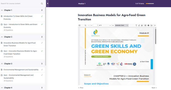 U sklopu projekta razvijen je modul, namjenjen učenicima i studentima zainteresiranim na teme zelenih vještina i tehnologija, ulogu u postizanju održivosti, inovativnih poslovnih modela u agribiznisu. Kroz seriju kratkih kurseva učesnicima su ponuđene osnovne informacije o ovim temama, kako bi se podigla svijest o značaju inoviranja i promociji održivih praksi poslovanja. Ukoliko želite pogledati navedeni modul, on je dostupan na ovom linku: https://veterans-project.eu/ , u gornjem desnom uglu „Platform“, potom izvršite osnovnu registraciju na platformi čime ćete steći uvidu u dostupni modul (ostali moguli su u razvoju i bit će dostupni u narednom periodu).
